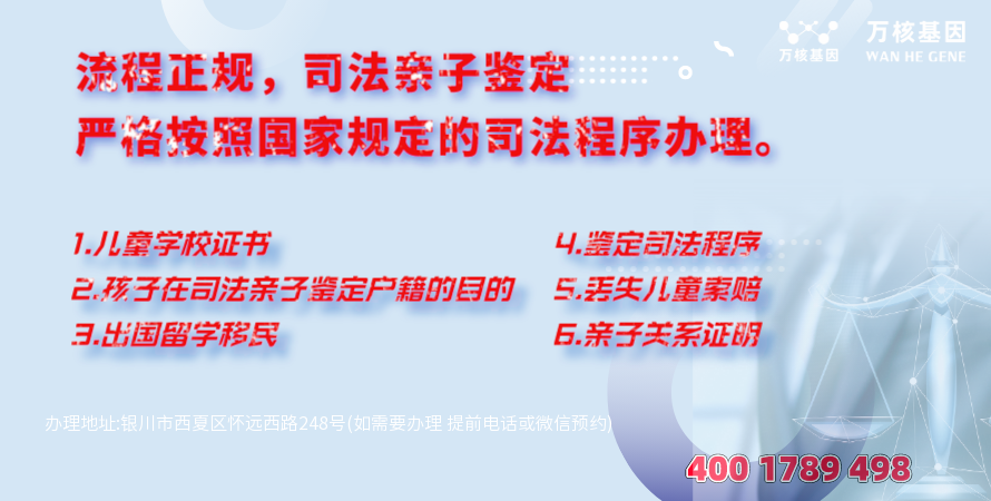银川西夏亲子司法鉴定办理地址:银川市西夏区怀远西路248号(如需要办理 提前电话或微信预约)-预约电话:4001789498。
